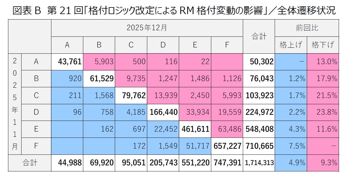 2025年12月に実施した「格付ロジック改定」により、RM格付の分布は、A~C格209,959件(構成比12.2%)、D格205,743件(同 12.0%)、E・F格1,298,611件(同 75.8%)となりました。(図表A)