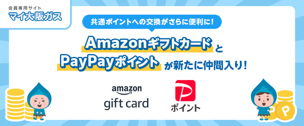 お客さまに幅広く『マイ大阪ガスポイント』をご利用いただくために、今回新たに「Amazonギフトカード」、「PayPayポイント」への交換サービスを追加します。貯まった『マイ大阪ガスポイント』を特定の条件で「Amazonギフトカード」「PayPayポイント」に交換することが可能です。