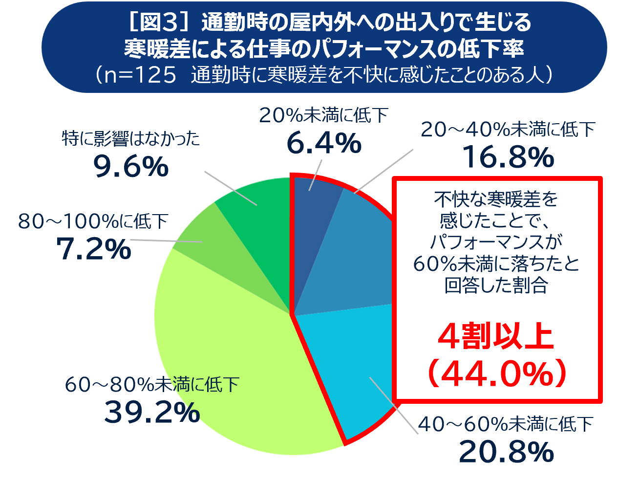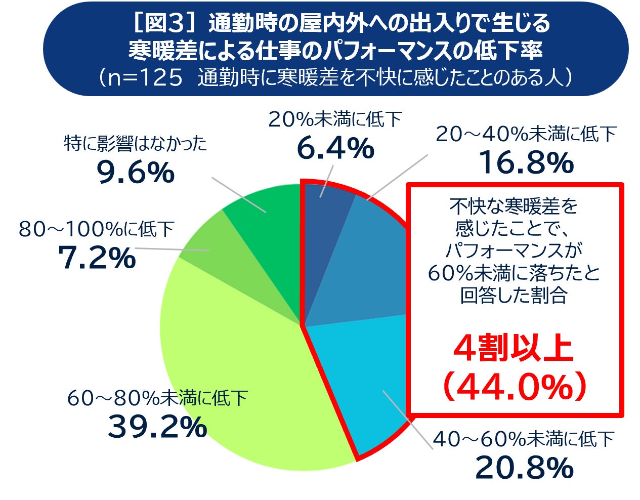 ◆夏場の通勤時に寒暖差を不快に感じた経験がある人の4割以上(44.0%)が、仕事のパフォーマンスが60%未満に低下したと回答。