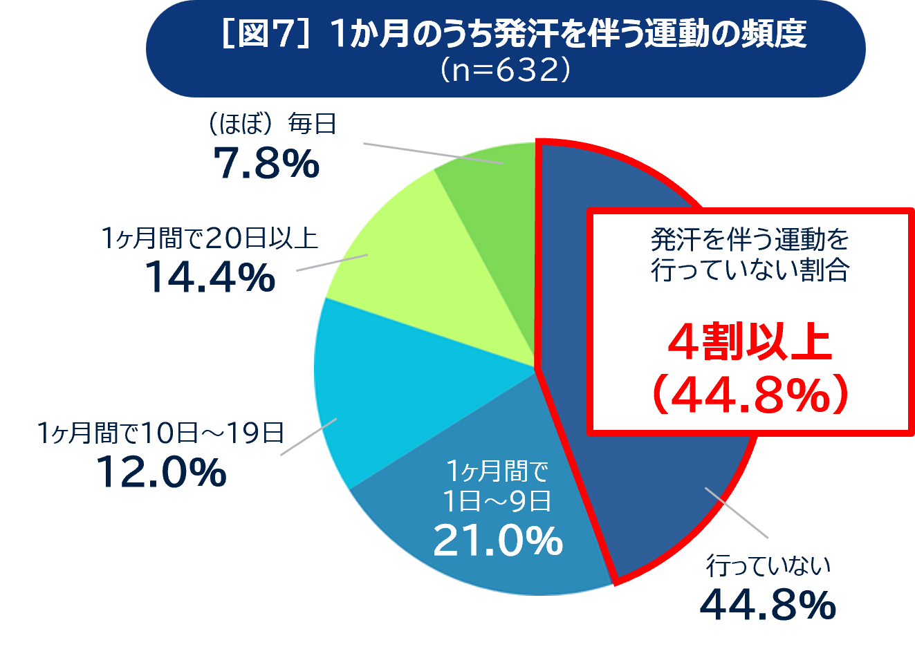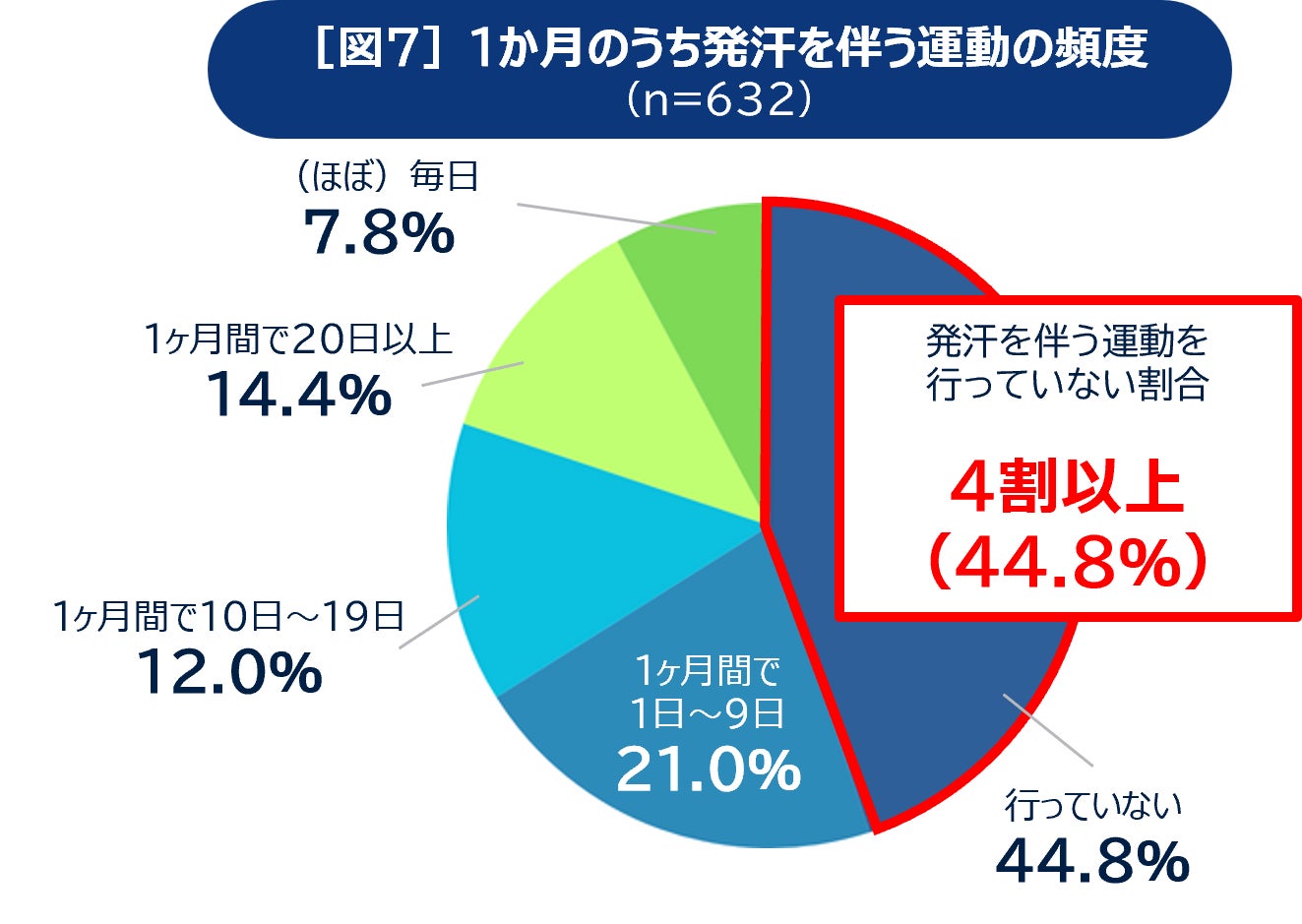 また、約4割(44.8%)が1ヶ月のうち発汗を伴う運動を「行っていない」と回答し、日頃から運動や身体のケアを十分に行えていないことがうかがえます[図7]。