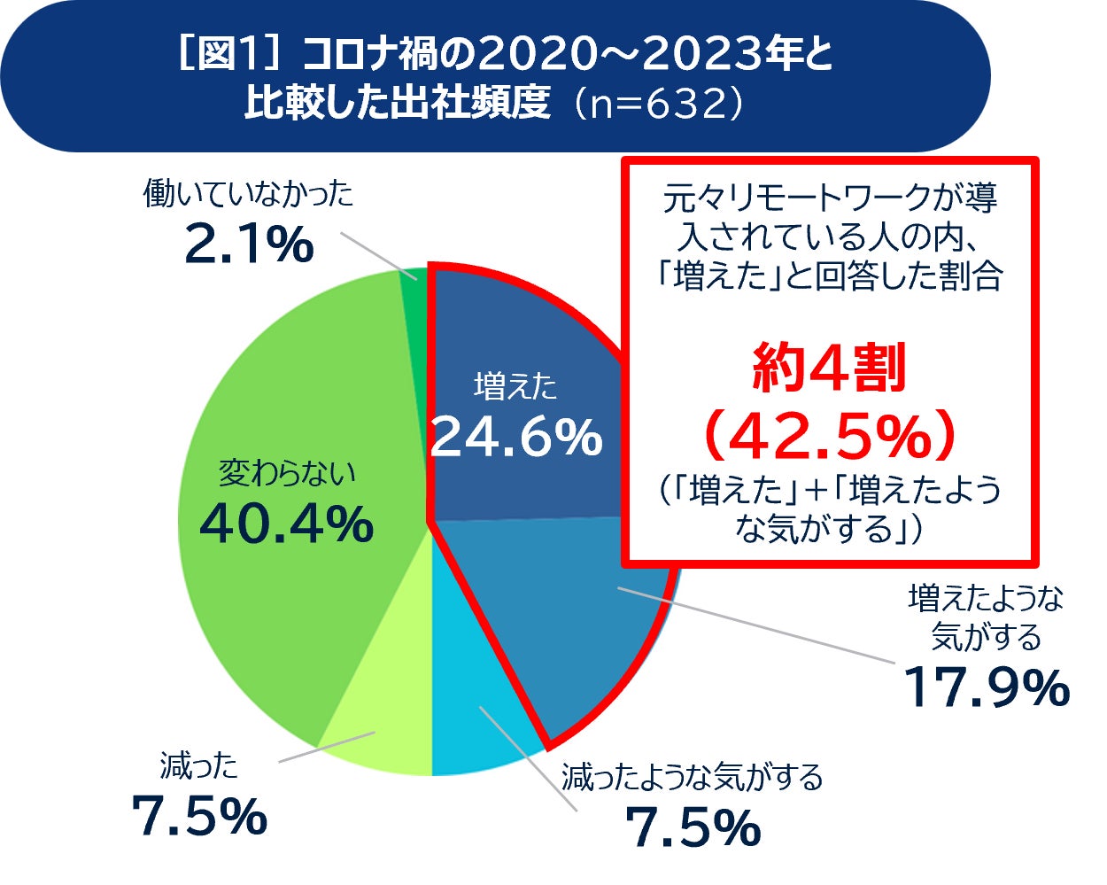 ◆リモートワーク可能な人においても、コロナ禍の2020~2023年と比較して約4割(42.5%)で出社頻度が増加。