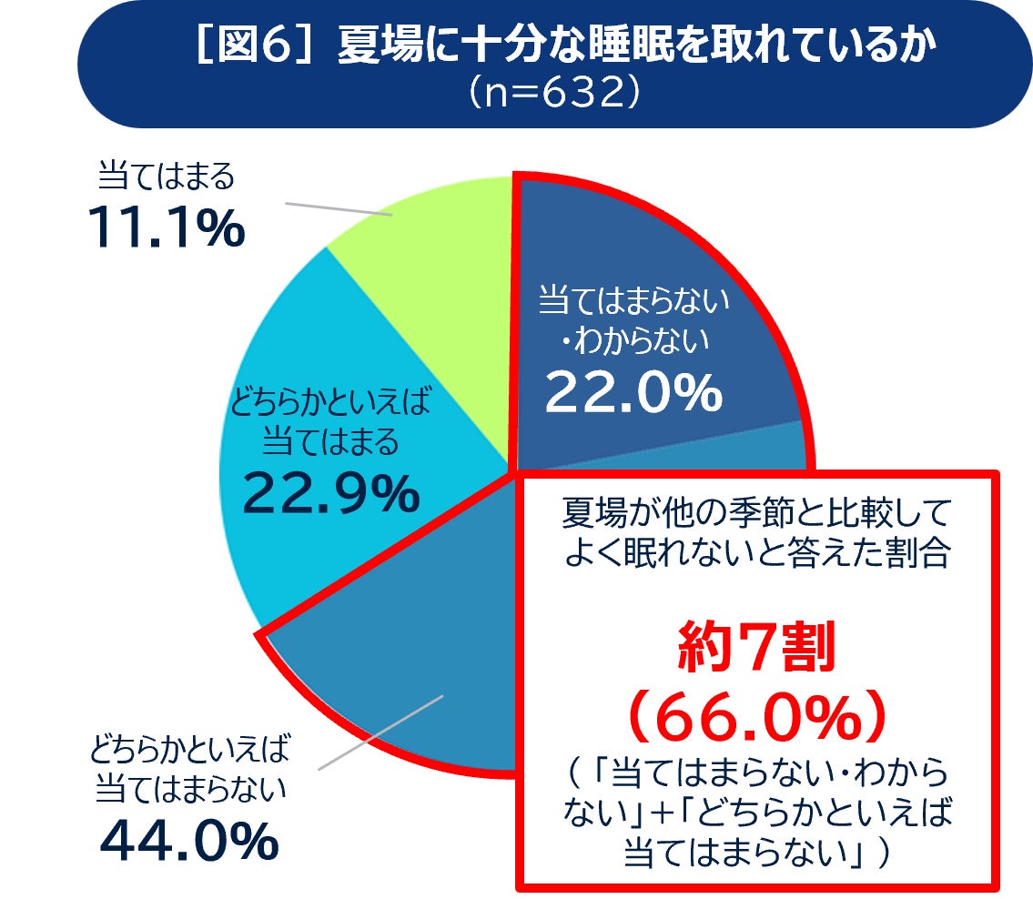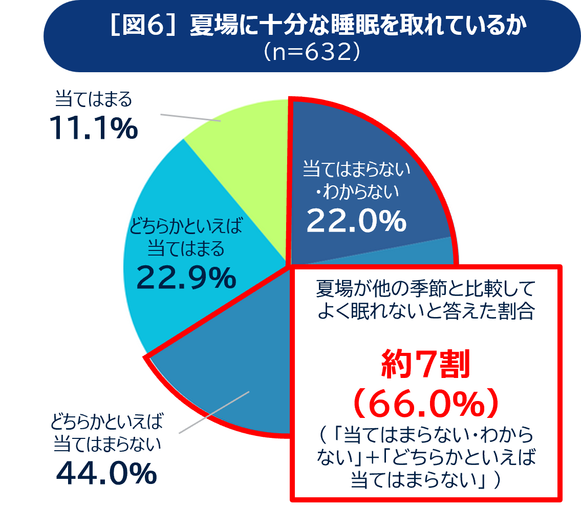 約7割(66.0%)が、夏場は他の季節と比べて「よく眠れない」と回答し、熱中症対策にとって重要な睡眠を十分に取れていないことがわかりました[図6]。