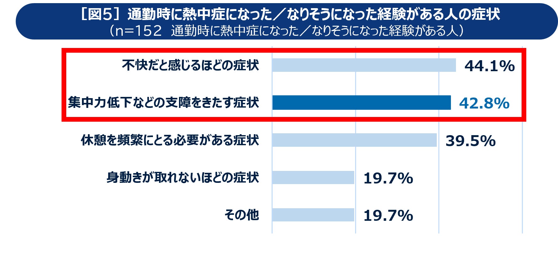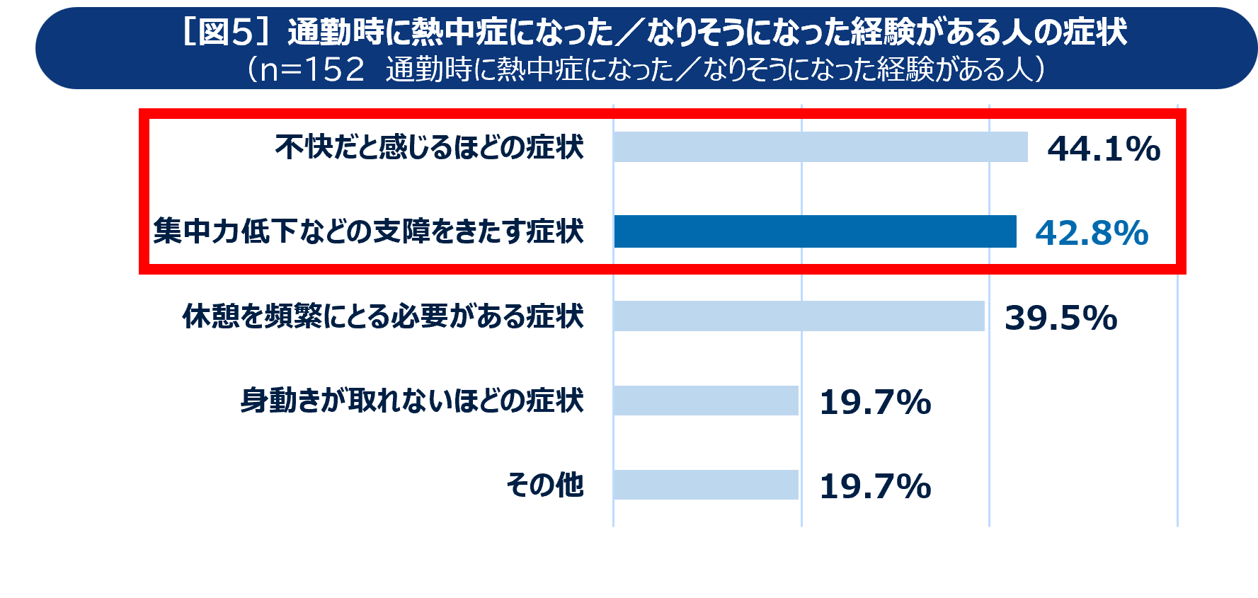 通勤時に熱中症になった(またはなりそうになった)自覚がある人の主な症状は、最も多いのが「不快だと感じるほどの症状」 (44.1%) 、次いで 「集中力低下などの支障をきたす症状」(42.8%)となりました。比較的自覚しにくく、対策を怠ってしまうような症状レベルであることから、軽症であるとしても熱中症の一歩手前になるリスクがあることを自覚し、重症化させないための正しい対策を身につける必要があることがわかりました[図5]。