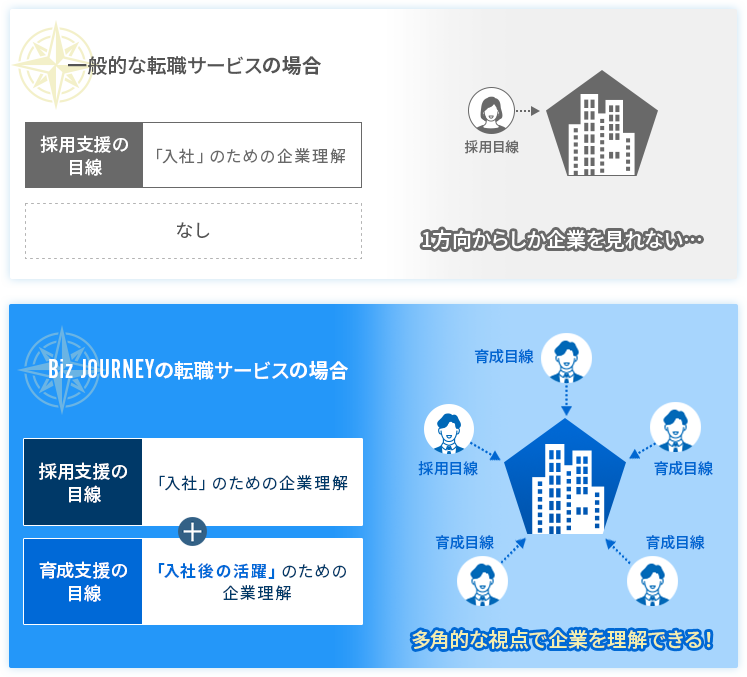Biz JOURNEYは、社員の成長を大切にしている「求人企業」と、転職後もスキルアップして活躍したいと考える「求職者」をお繋ぎする転職支援サービスです。