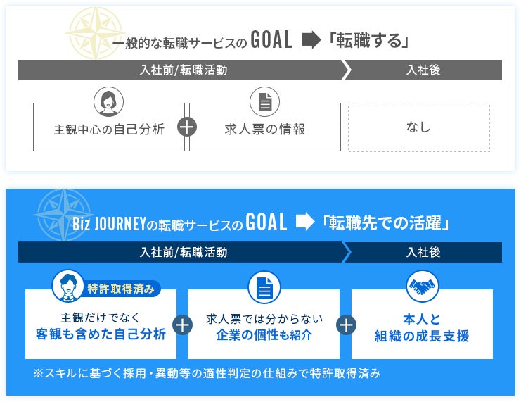 一般的な転職サービスと違い、Biz JOURNEYは「転職すること」をゴールにせず、「転職先で活躍できること」をゴールとして転職支援することが特徴です。