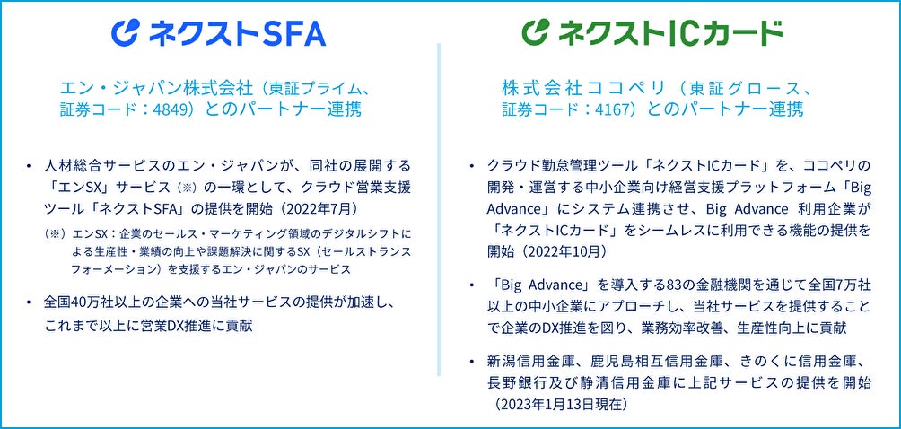 売上高は、Webサイト制作が+23.5%、Web広告が+7.5%、ネクストSFAが+24.2%と前年同四半期比で推移するも、SEO対策が△8.0%と伸び悩んだこともあり、合計で+0.6%での進捗にとどまる。Webサイト制作は、自社のマーケティングが成果につながっており、問い合わせやセミナーから大型案件の引き合いが増加傾向にあります。ネクストSFAは、2022年7月にパートナー連携をしたエン・ジャパン株式会社(東証プライム)からの紹介が順調に伸びている状況です。同クラウドセールステック事業のネクストICカードでは、2022年10月に株式会社ココペリ(東証グロース)とのパートナー連携を行っており、金融機関を通じて全国各地の中小企業へのアプローチを想定しています。