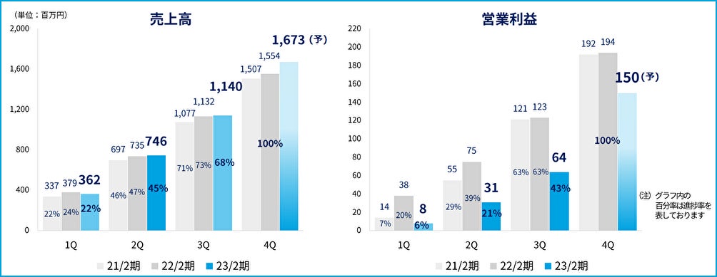 なお、2023年2月期第1四半期より「収益認識に関する会計基準」(企業会計基準第29号)等を適用しているため、Webマーケティング事業のうちWeb広告取引に係る売上を純額表示に変更しています。そのため、本発表においては、比較のため、過年度の売上高を当該会計基準等適用後の数値に置き換えて表示しております。売上総利益以下の各段階利益の金額には影響はなく、純額表示への変更により売上高利益率は改善しています。