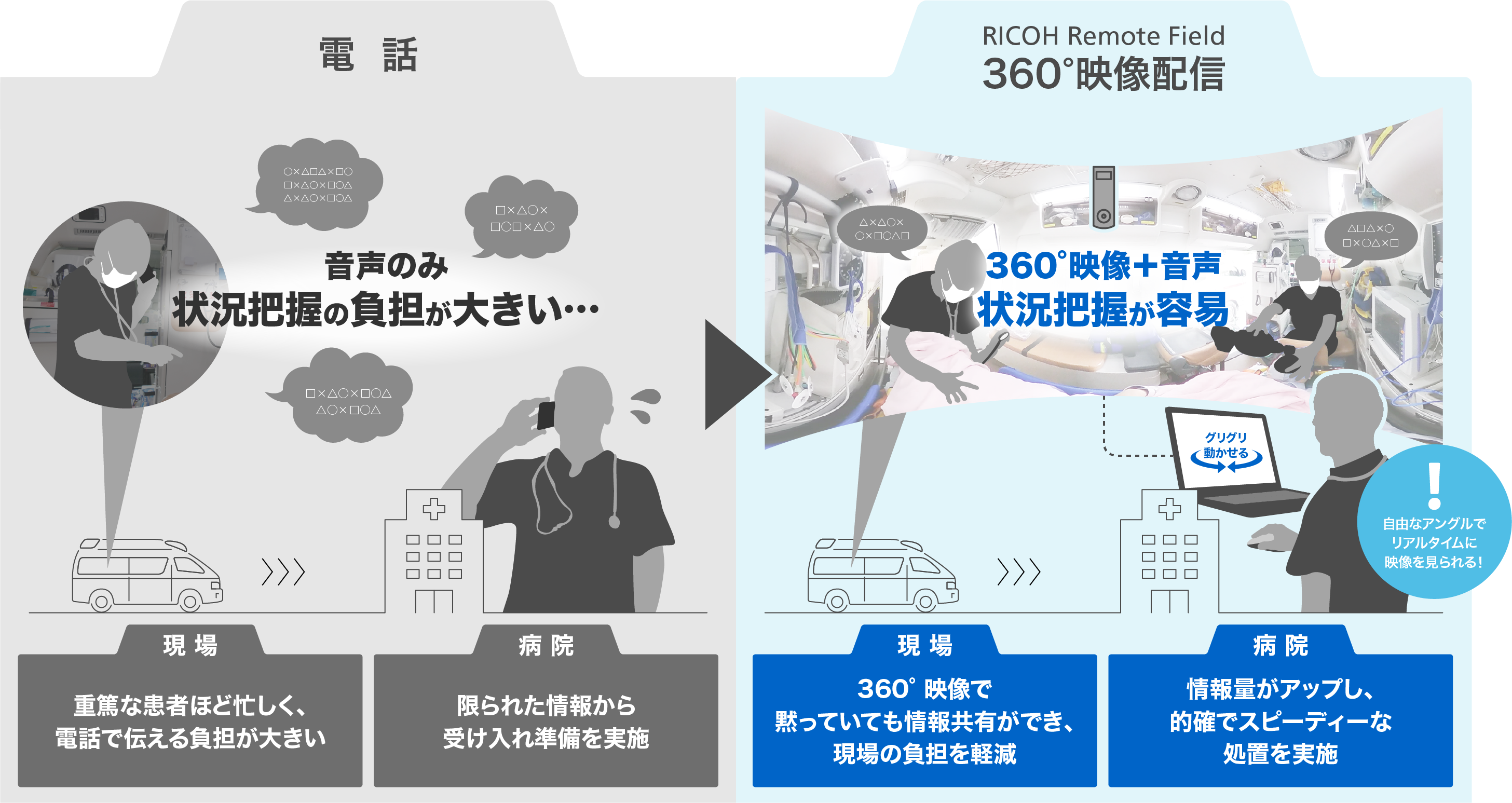 実証実験では、県内の第3次救急医療を担う佐賀大学の所有する一部のドクターカー、ドクターヘリの内部に「RICOH Remote Field」を搭載し、搬送先への中継を行います。「RICOH THETA」の360°映像を高解像度・低遅延で配信し、病院に待機するスタッフと共有します。救急医療の機能強化に向けた、映像によるリアルタイムでの情報共有の有用性を検証します。