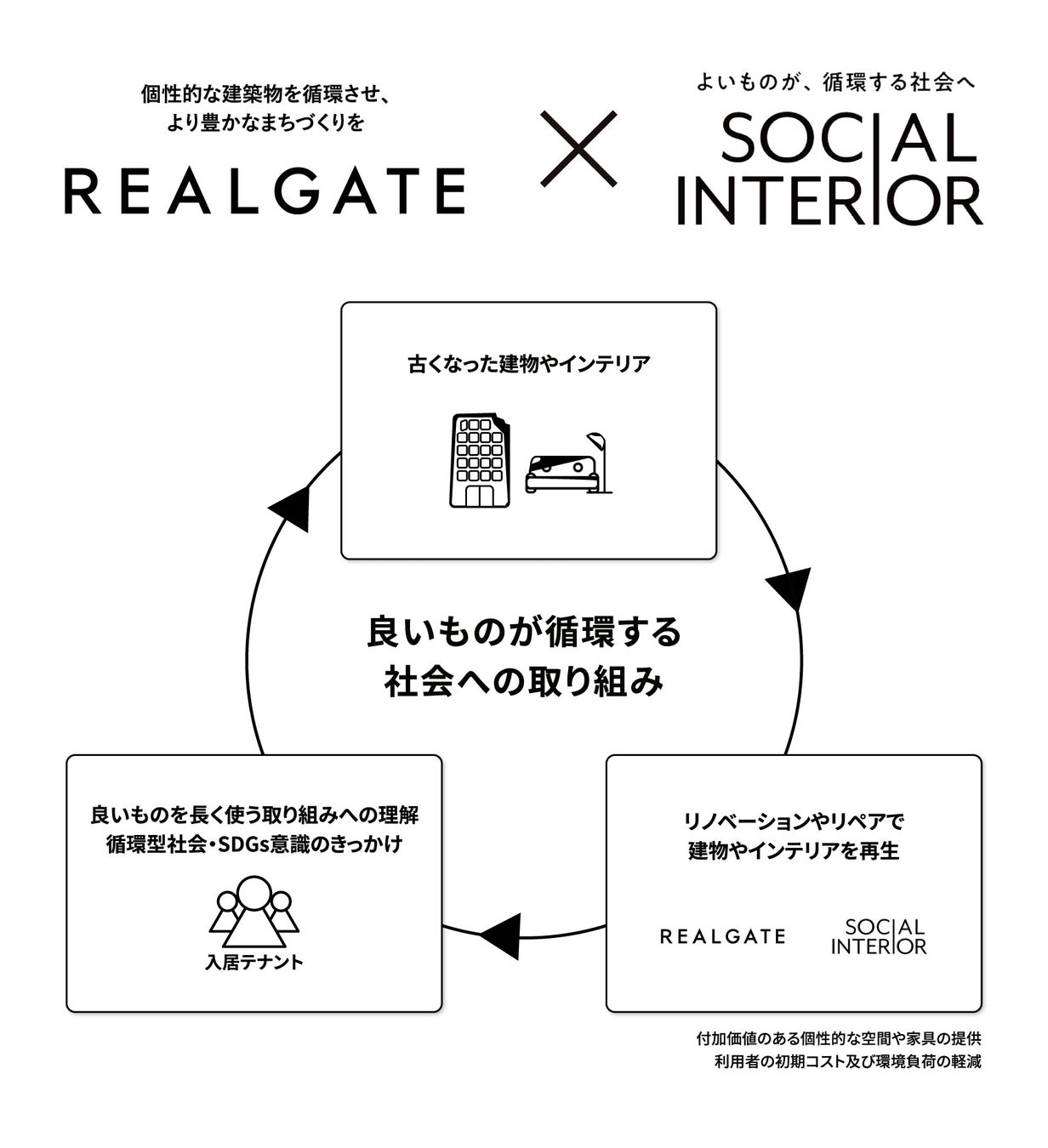建築物を循環させ、より豊かな街づくりを目指すリアルゲイトは、「よいものが、循環する社会へ」というビジョンを掲げているソーシャルインテリアとの親和性を感じ、これまでリアルゲイト運営オフィスのモデルルーム構築等で協業してきました。