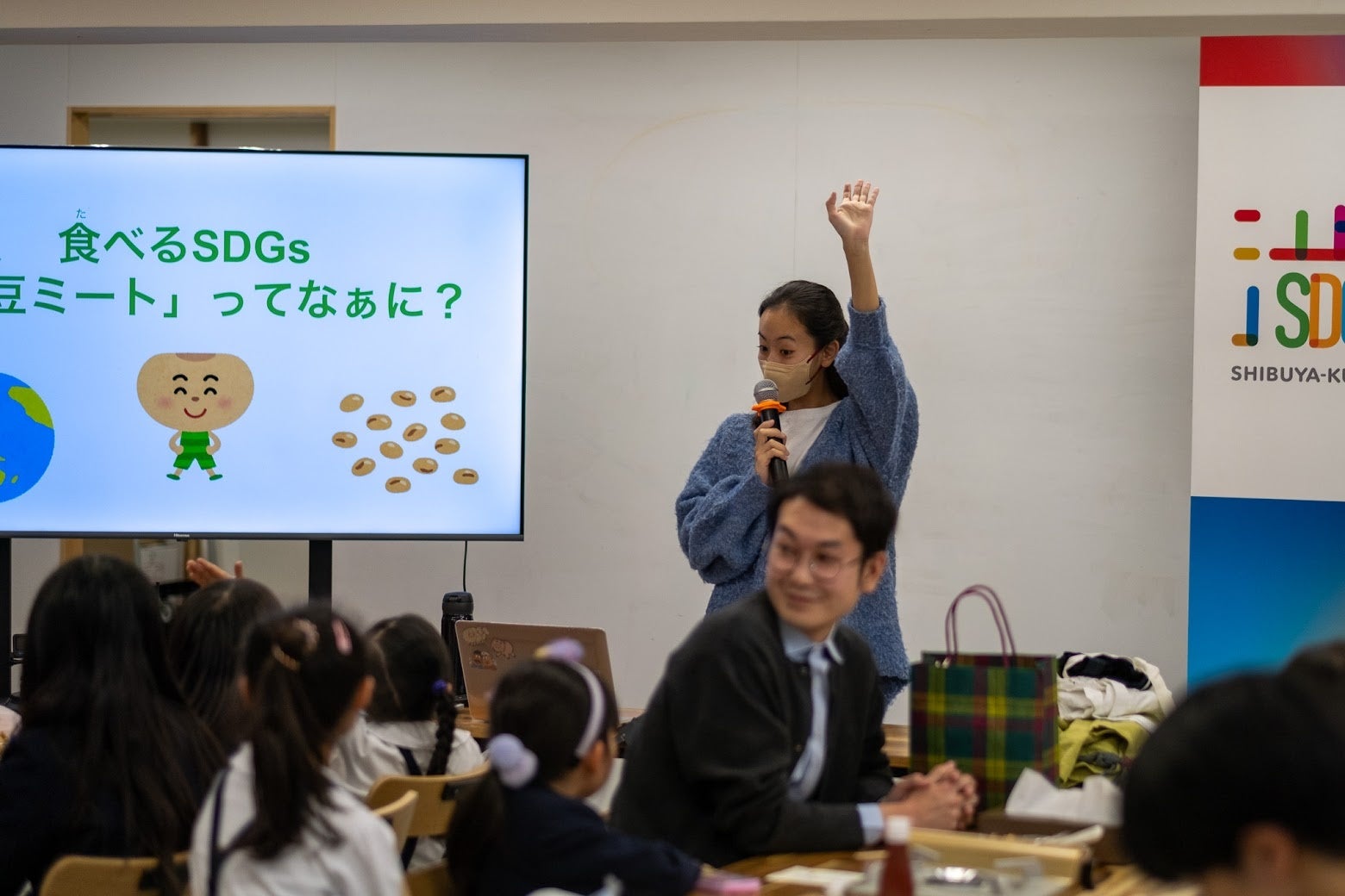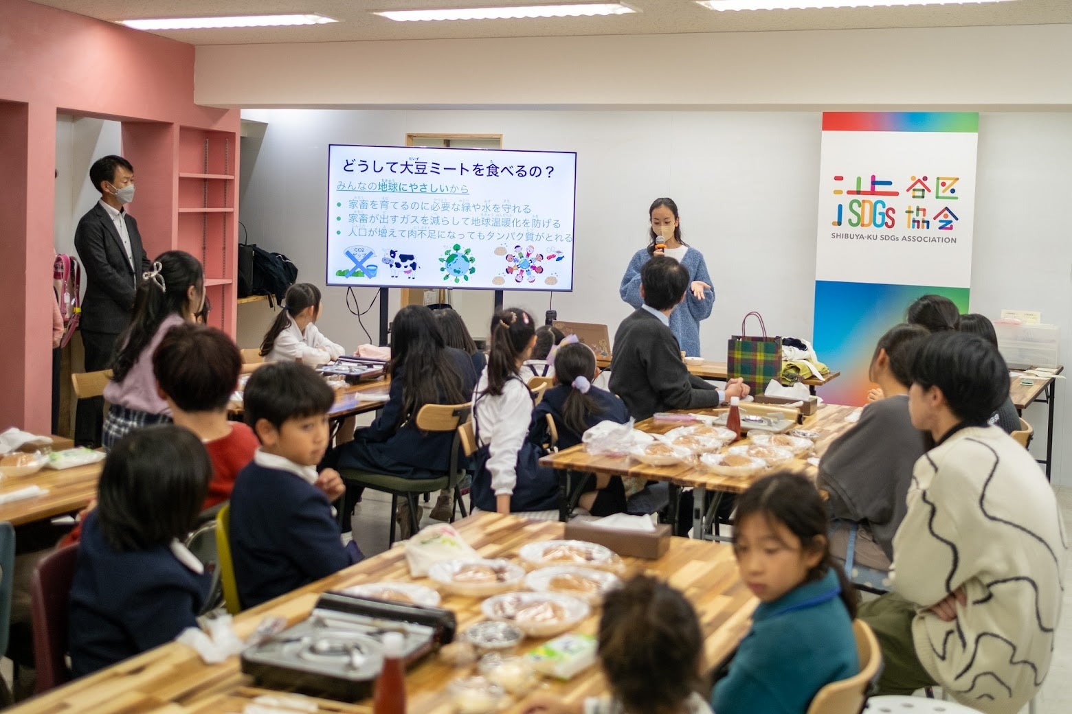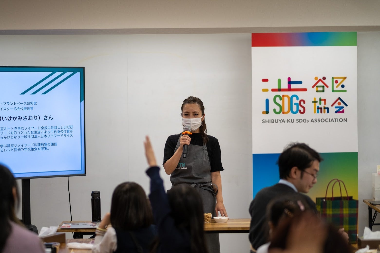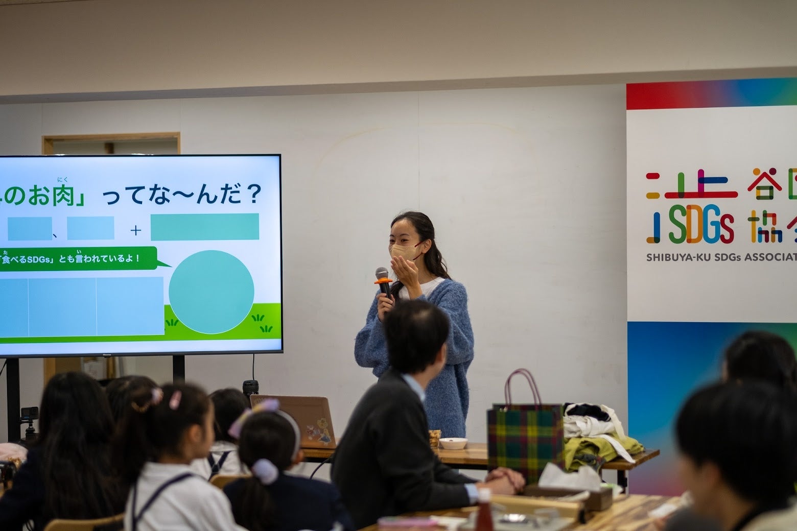 当日はソイフード研究家・池上紗織さんと渋谷区SDGs協会で活動する学生スタッフから、「渋谷センター街こども食堂」に集まる周辺地域の子どもたちへ、大豆ミートについてレクチャーしていただきました。