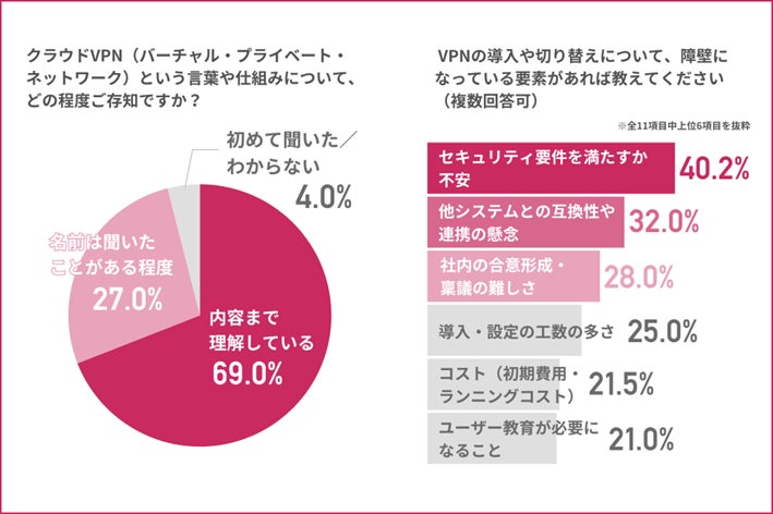 クラウドVPNの認知度については、「内容まで理解している」が69.0%に達し、「名前は聞いたことがある程度」が27.0%、「初めて聞いた/わからない」は4.0%という結果となりました。比較的新しい方式でありながら、すでに7割近くが仕組みを理解していることから、市場における浸透の速さが示されています。(図表3)