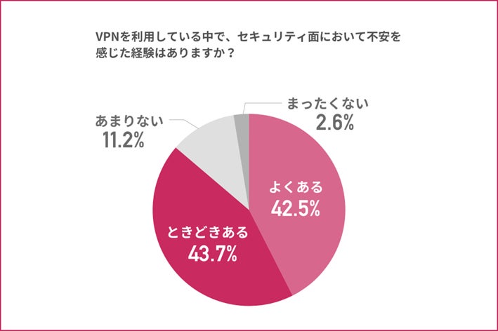 「VPN利用中にセキュリティ面で不安を感じた経験があるか」という問いに対して、『よくある(42.5%)』『ときどきある(43.7%)』と、約9割が不安を感じた経験があると回答しました。セキュリティリスクへの懸念は依然根強いことが示されました。(図表2)