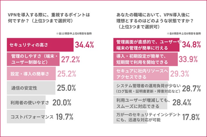 VPN導入後に理想とする状態としては、「直感的な管理画面でユーザーや端末を簡単に制御できる(34.8%)」「導入・初期設定が容易で短期間で利用を開始できる(33.9%)」「セキュアに社内リソースへアクセスできる(29.3%)」といった回答が上位となりました。導入のしやすさと運用負荷の軽減が、現場における切実な要望であることが明らかになりました。(図表4)