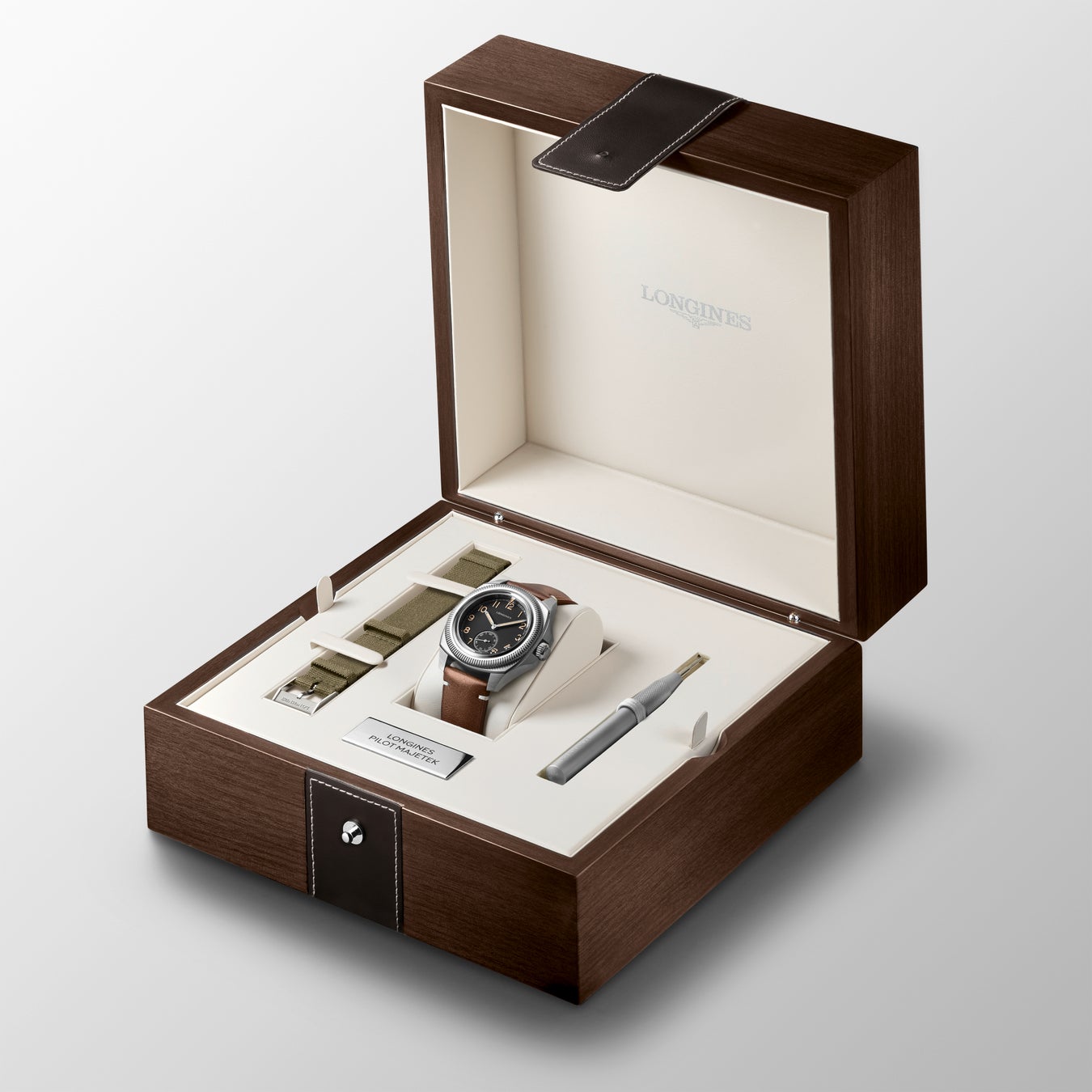 ストラップ:ベージュのステッチ付きブランレザーストラップ (L2.838.4.53.0)・リサイクル素材からできたカーキグリーンの NATO ベルト(L2.838.4.53.8)のセット ※ストラップ交換ツール付属 ※初回:スペシャルBOX入り