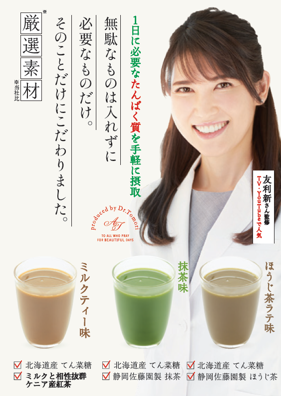 プロテインの認知度があがり、いろいろな商品が出てきた中で選ぶポイントとしたいのが、 味と信頼感。この商品は「抹茶」と「ほうじ茶ラテ」フレーバーのため、日常的に取り入れやすく おやつ感覚で取り入れられます。美容賢者として大活躍している友利新先生が監修しているプロテインのため信頼もできる商品です。また、約15gのたんぱく質を摂取できるほどの高タンパク質を配合しているため「ボディケアを始めたいけど、いきなり運動を始めるのはハードルが高い」という方にもおすすめです。