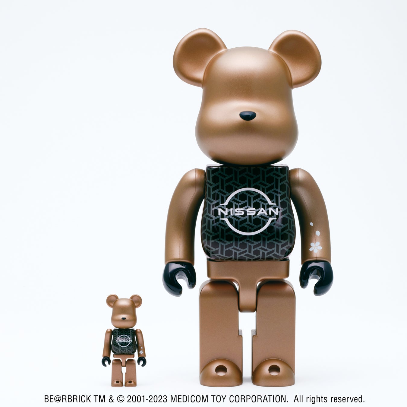日産創立90周年を記念して特別に作られた「NISSAN 90th ANNIVERSARY BE@RBRICK 100% & 400%」は、日産のEVラインナップを連想させる「サンライズカッパー」をベース色として採用しました。「タイムレス・ジャパニーズ・フューチャリズム」というデザインコンセプトのもと、時を超えて受け継がれる日本のDNA、その美しさを感じさせるデザインとして、モダンでシンプルな雰囲気を醸成している「組子」模様や、左手に桜デザインがあしらわれています。