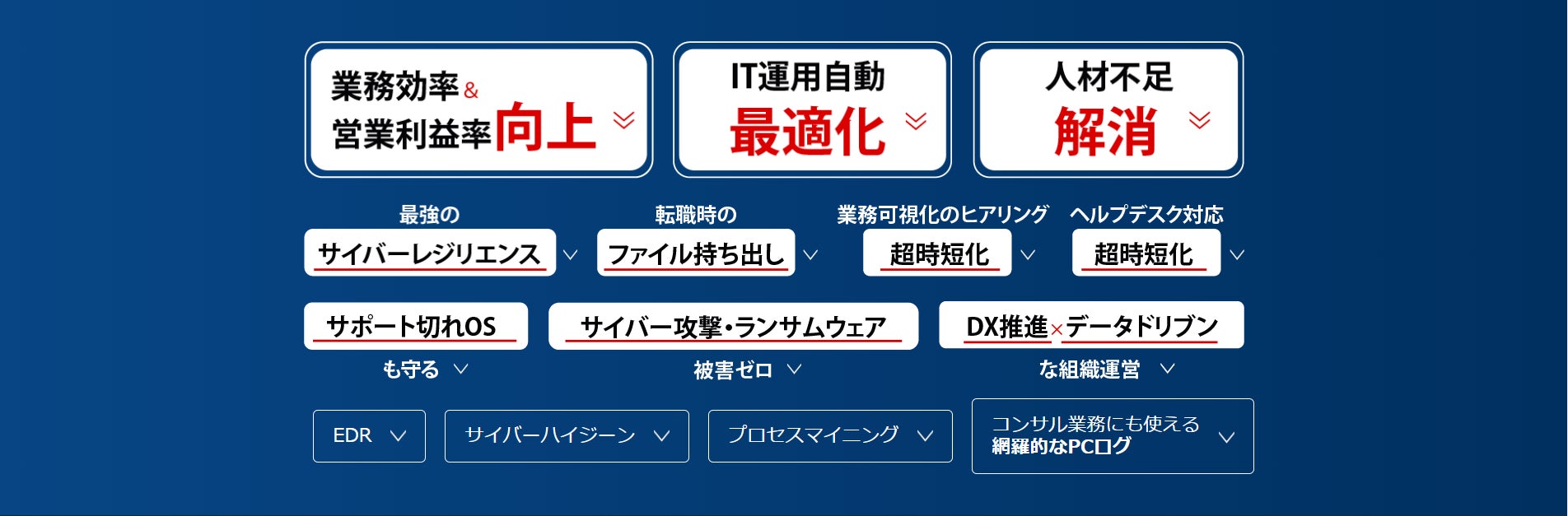 SePはヘルプデスク業務、IT環境最適化、ネットワーク監視、システム管理、サイバー攻撃・情報漏洩対策など、情報システム部のあらゆるニーズにオールインワンで応えるソリューションです。社内PC上の操作・通信・プロセス起動・編集ログを網羅的に常時収集し、リアルタイムに把握できるEDR-Realtime Analyticsという独自のテクノロジーにより、これらの課題を一挙に解消し企業のIT運用DXに貢献します。