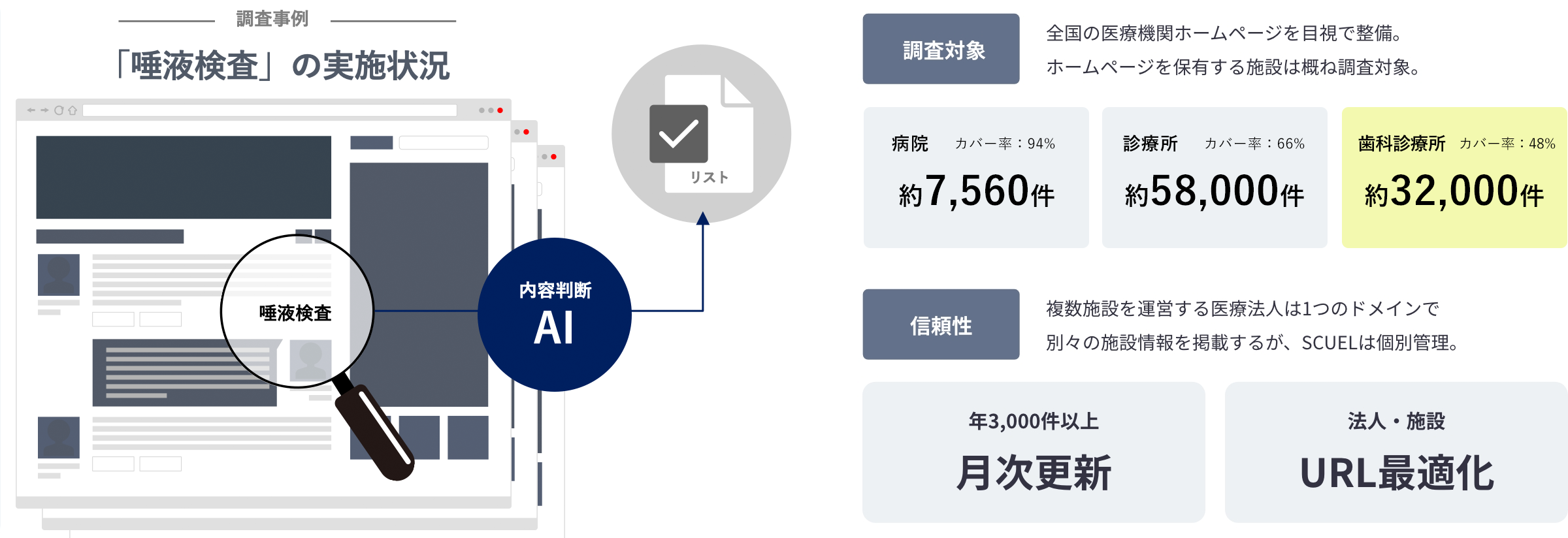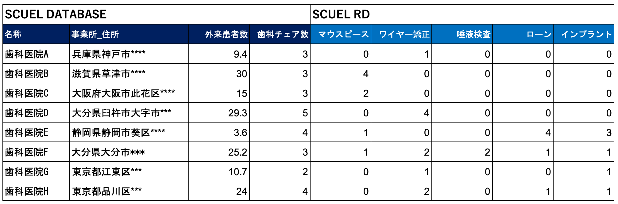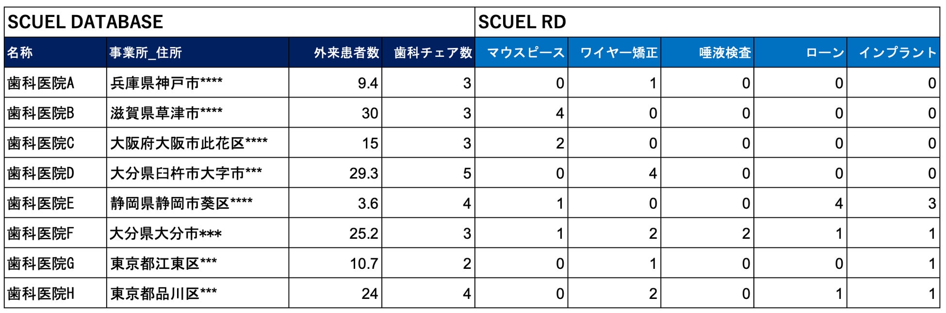 ミーカンパニーが保有する「SCUELデータベース」では、施設基準、専門医の在籍状況、開設年、ユニット数、人員体制などを網羅的に収録していますが、今回、新たに医院のホームページ上の発信内容を解析可能にする「SCUEL RD」を組み合わせることで、医院の方針・志向・関心領域をより高い解像度で把握できるようになりました。