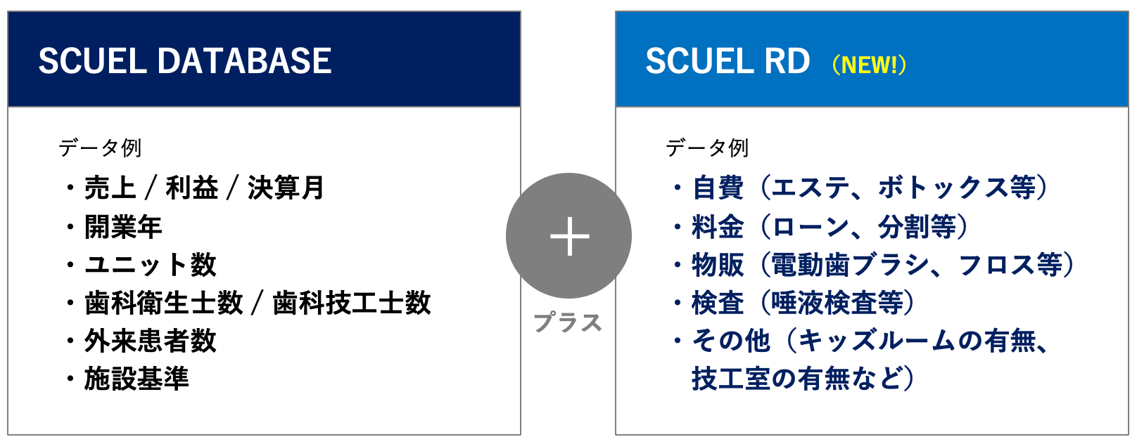 「SCUEL RD」は、医療機関のホームページ情報を解析し、診療・施術・製品・サービスに関するキーワードの出現・文脈・関連性を抽出するリサーチサービスです。「SCUEL RD 歯科版」は、利用目的に応じて以下の2つのモデルを提供しています。