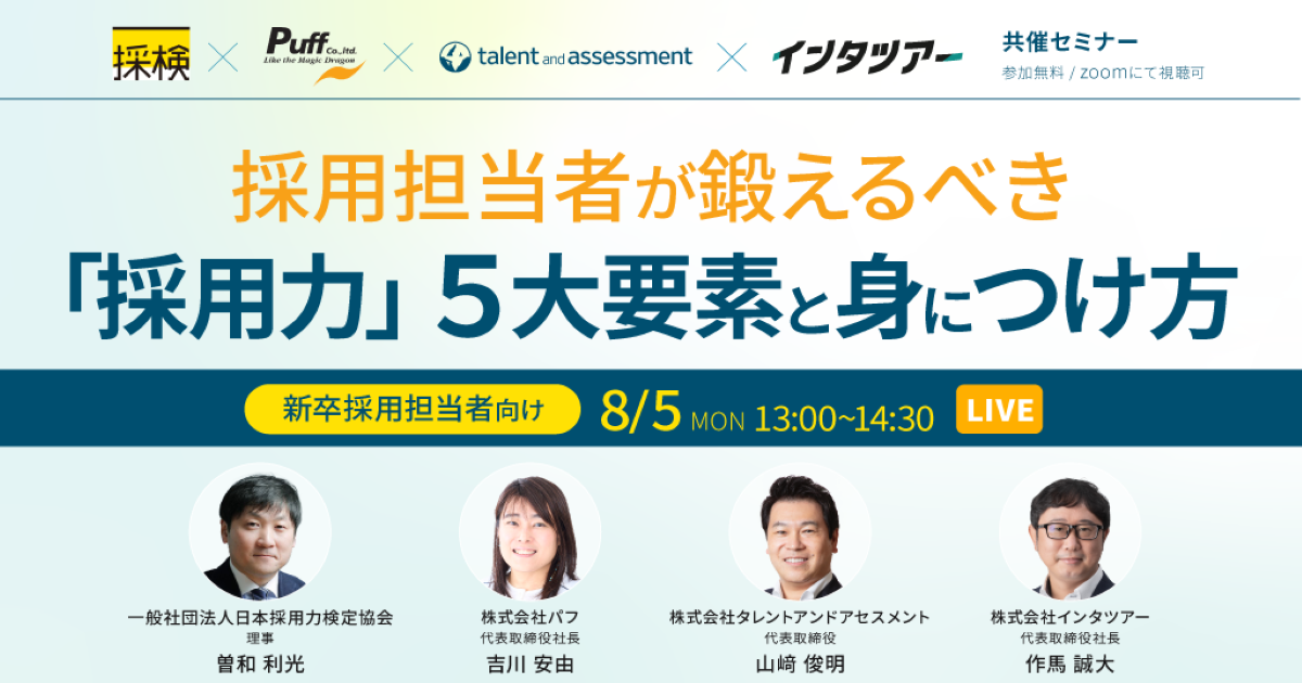今回のセミナーは、日本採用力検定協会の理事を務める曽和利光氏(株式会社人材研究所代表取締役社長)に加え、その賛助会員企業3社によるパネルディスカッション形式で、徹底解説いたします。