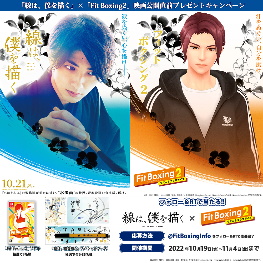 現在、Fit Boxing 公式Twitterアカウントにて、横浜さん主演映画『線は、僕を描く』とのコラボキャンペーンを開催しています。Fit Boxing公式Twitterアカウントをフォローし、該当の投稿をリツイートした方の中から抽選で映画『線は、僕を描く』オリジナルグッズやNintendo Switchソフト「Fit Boxing 2」をプレゼントします。