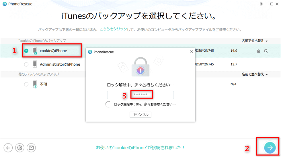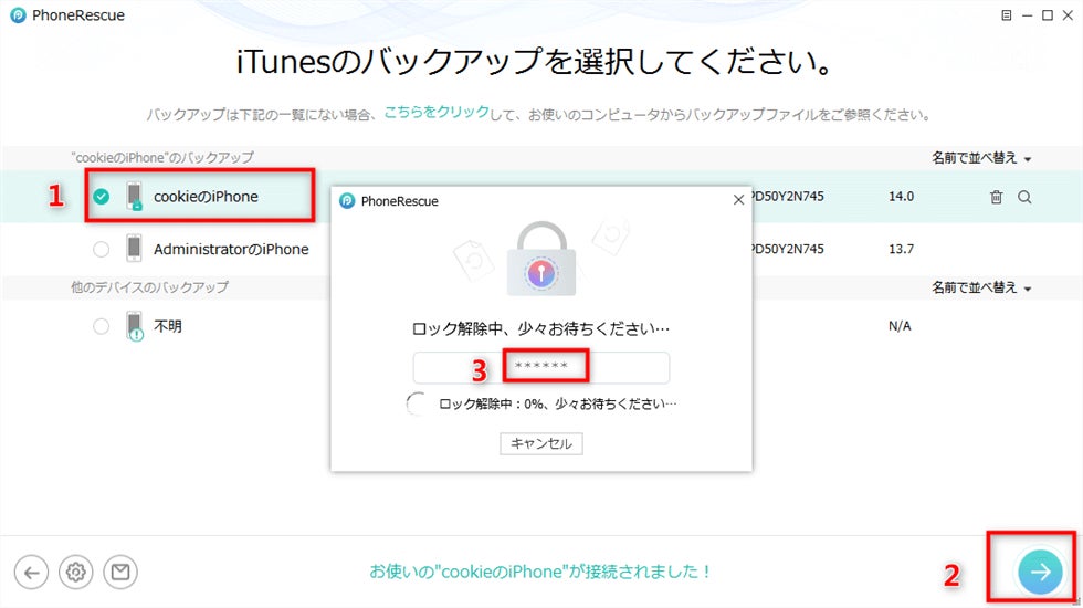 Step 2:iTunesバックアップを選択し、暗号化のパスワードを入力すれば、バックアップの読み取りは始まります。