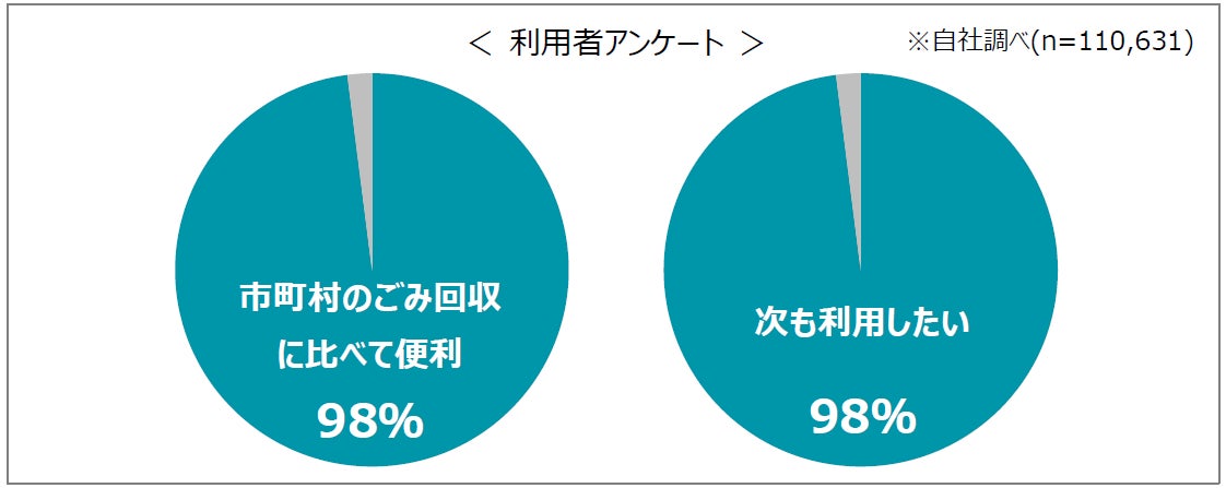 利用者アンケートでも98%が「市町村のごみ回収に比べて便利」、98%が「次も利用したい」と回答 し、満足度の高いサービスとして評価をいただいています。