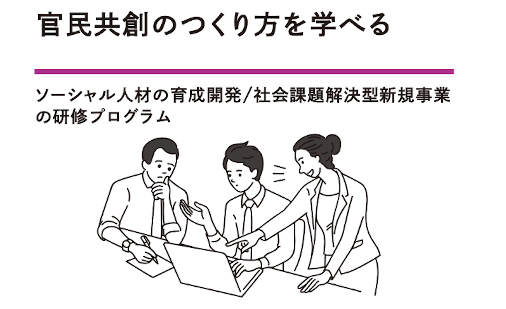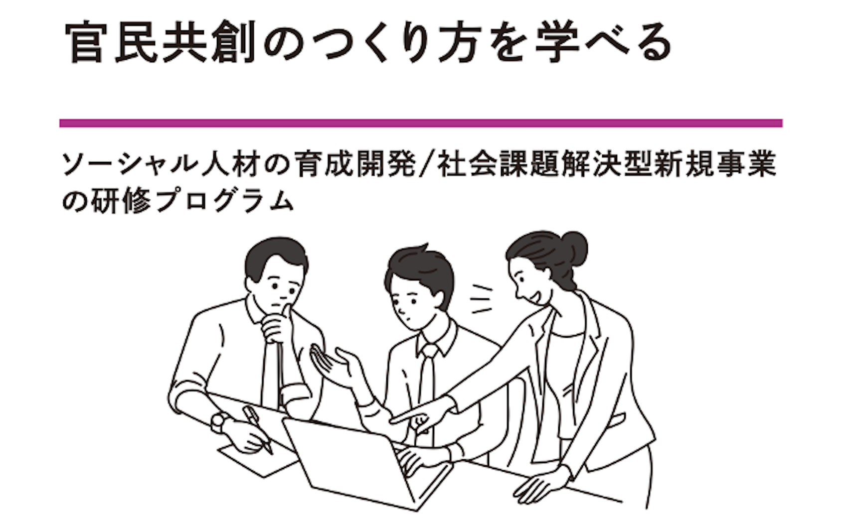 本研修では、行政とのコラボレーションによって社会課題の解決を図る、新しい形の新規事業開発の場において、官と民、双方の立場や物事の進め方、考え方の違いなどを理解し、プロジェクトをスムーズかつスピーディに進めるコツやノウハウを学ぶことを目的とします。