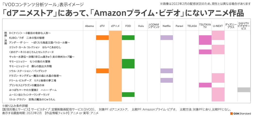 エンタテイメント業界に向けたデータ×デジタルマーケティングサービスを提供するGEM Partners株式会社(ジェムパートナーズ、所在地:東京都港区、代表取締役:梅津文)は4月1日(金)、動画配信(VOD)サービスのコンテンツ配信状況についてプラットフォームを横断して比較・分析できるオンラインダッシュボード「VODコンテンツ分析ツール」の提供を開始いたします。