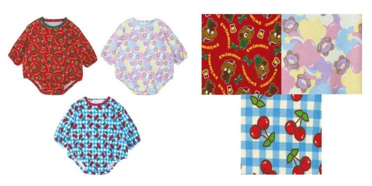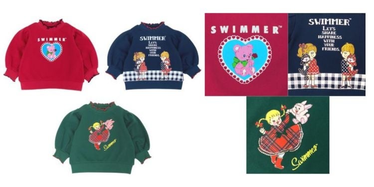 今回発売するのは、「メロウ配色プリントスウェットシャツ」「総柄ボディオール」の2商品です。「メロウ配色プリントスウェットシャツ」は、衿と袖口のメロウ仕上げがかわいい長袖スウェットシャツで、SWIMMERらしいノスタルジックなキャラクターのプリントが前面に施されています。「総柄ボディオール」は、丸みのあるシルエットが特徴で、はいはいやよちよち歩きのお子さんでもお腹が冷えにくい上下一体型の長袖ウェアです。秋冬の季節感を意識したクリスマス柄(レッド系)など、それぞれに個性豊かな計3パターンの柄展開となっています。