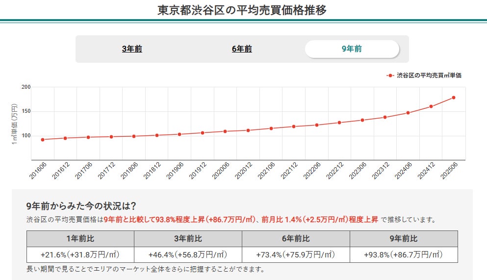 渋谷区のマンション価格は、過去9年で93.8%の価格上昇率を記録し、再開発エリアの拡大や生活インフラの整備、都心立地の価値が相まって、安定した資産性を維持しています。