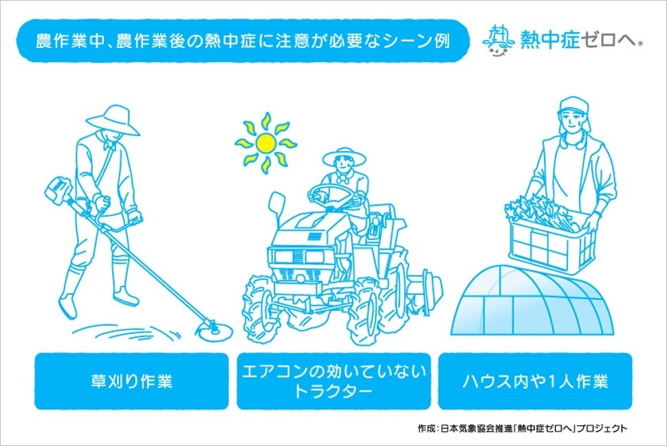 草刈り作業や薬剤散布のとき、エアコンの効いていないトラクターで作業するとき、個人農家やハウス内での水やり作業時などが挙げられた。