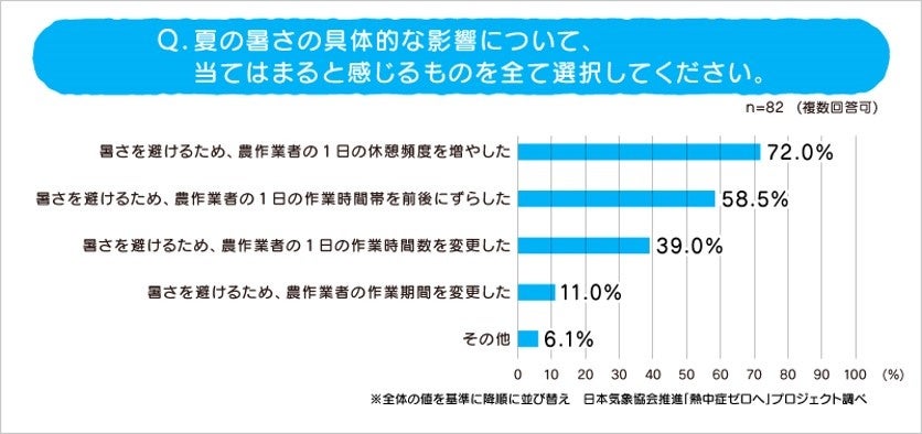 具体的には、1日の休憩頻度を増やす、作業時間帯をずらす、作業時間数を変更するなど、暑さを避ける人が多かった。