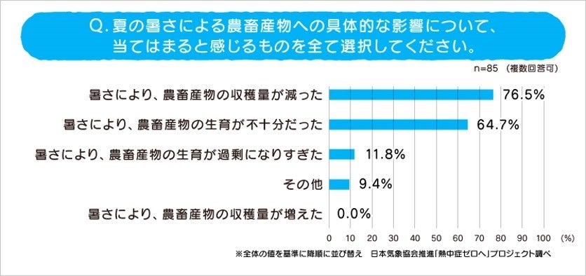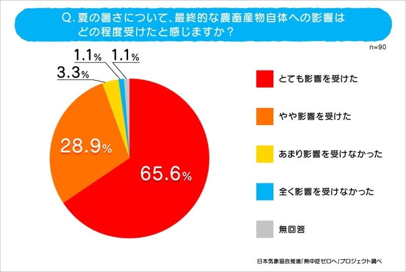 夏の暑さについて、農畜産物自体への影響はどの程度受けたと感じるか聞いたところ、「とても影響を受けた(65.6%)」、「やや影響を受けた(28.9%)」と、合わせて約95%が影響を受けたと回答しました。具体的には、暑さにより「農畜産物の収穫量が減った」が76.5%、「農畜産物の生育が不十分だった」が64.7%と、農畜産物の「生育・収穫量」に関して影響を感じていることが分かりました。