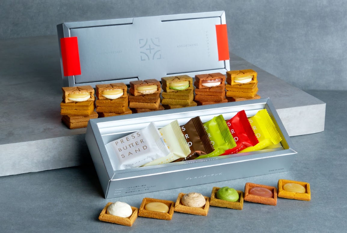 通常はその地域でしか手に入らない限定フレーバー全種と、プレスバターサンドの定番を詰め合わせた記念商品。バタークリームとバターキャラメルの2層仕立ての定番バターサンド、北海道れん乳とうきび、栗、宇治抹茶、檸檬、あまおう苺の6種を一度に味わえる贅沢なセット。プレス機をイメージしたインダストリアルなパッケージからも、特別感を感じられます。