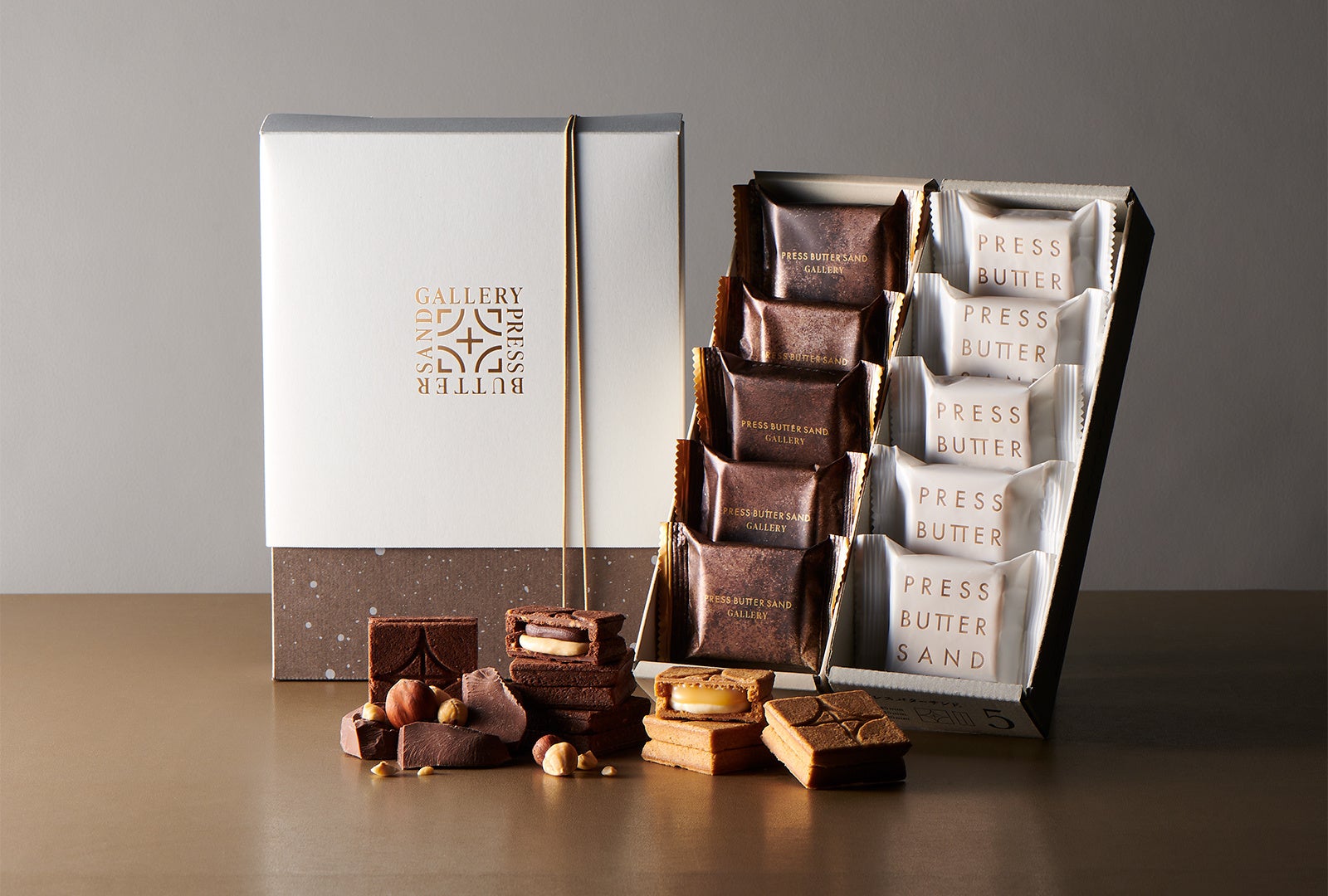 「プレスバターサンドギャラリー有楽町マルイ店」限定の2種セットBOX。不動の大人気「バターサンド5個入」と、ショコラとナッツの奥深く甘い香りがあふれる「バターサンド〈ヘーゼルナッツショコラ〉5個入」がセットになった特別な商品です。キャンバスに絵具が飛び散ったようなデザインで、自由奔放で遊び心のあるアーティスティックなパッケージに仕上げています。