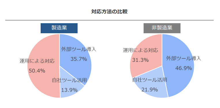 具体的な対応方法については、非製造業の企業は電帳法改正への対応として最適な「外部ツール導入」が最も多い結果となった一方で、製造業の企業は対応漏れリスクがある、業務プロセス上での「運用による対応」が最も多い結果となりました。