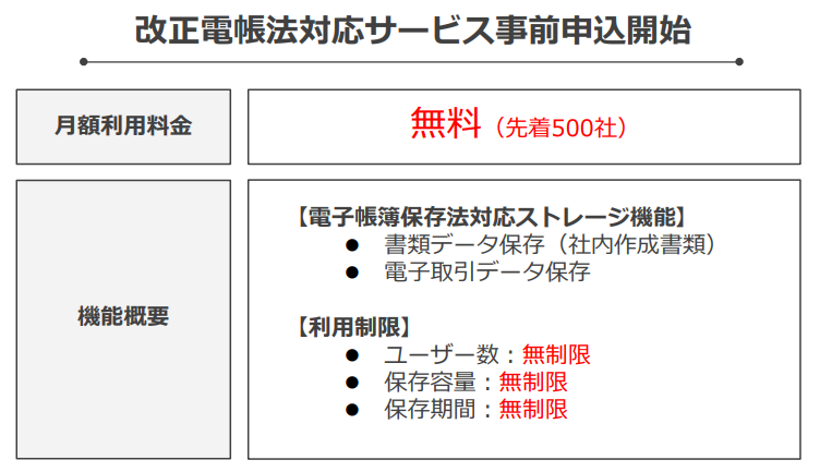 - 機能概要:電子帳簿保存法対応ストレージ機能、ユーザー数・保存容量など無制限