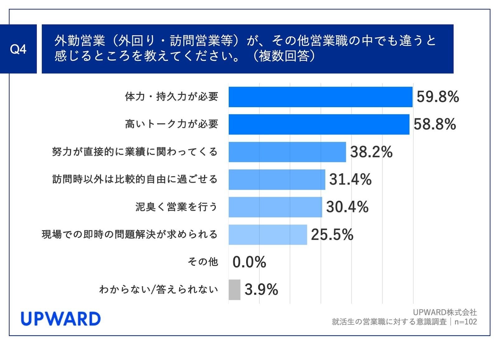 「Q4.外勤営業(外回り・訪問営業等)が、その他営業職の中でも違うと感じるところを教えてください。(複数回答)」(n=102)と質問したところ、「体力・持久力が必要」が59.8%、「高いトーク力が必要」が58.8%、「努力が直接的に業績に関わってくる」が38.2%という回答となりました。
