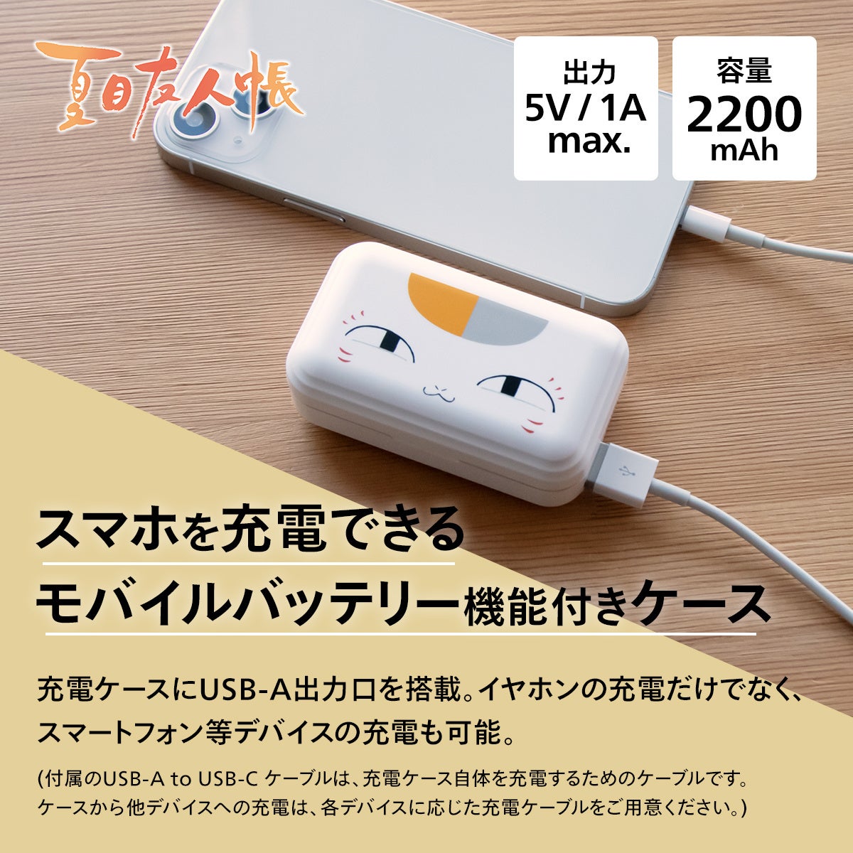 イヤホンケースはモバイルバッテリー機能付きで、USB-A出力口からスマートフォン等デバイスへの充電が可能です。