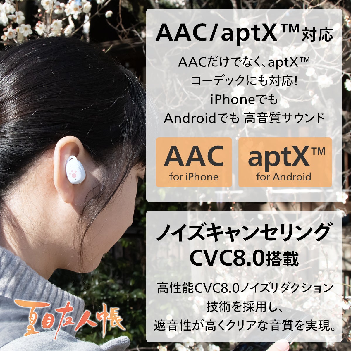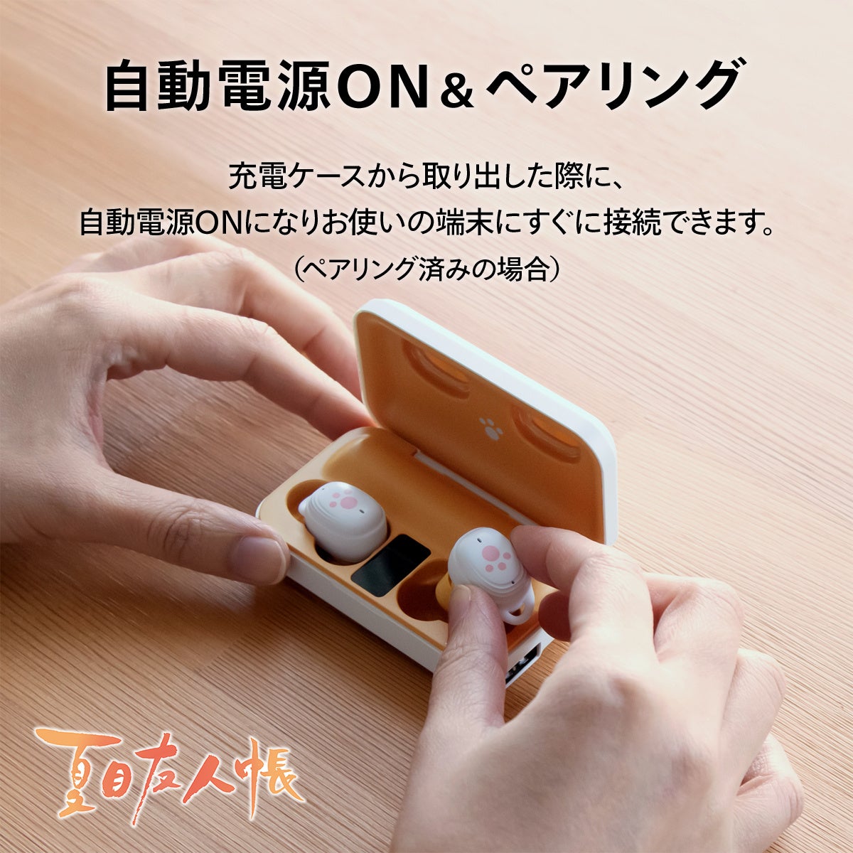 電源オン時やイヤホン接続時などに、ニャンコ先生の声でアナウンスされる特別仕様のワイヤレスイヤホンです。