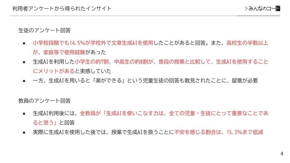 プロジェクトに参加した児童・生徒・教員のアンケート結果から、生成AIは児童・生徒の創造力を引き出し、学びの質を高める強力なツールであることを再認識しました。みんなのコードは、今後も「誰もがテクノロジーを創造的に楽しむ国にする」というビジョンに向けて、学校での生成AIの適切な取り組みが進むようサポートして参ります。