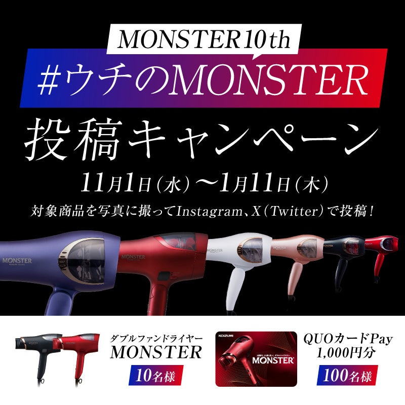 小泉成器株式会社(本社:大阪市中央区備後町/代表取締役社長:橋本直志)は、11月1日(水)より、ダブルファンがつくるパワフルな大風量ドライヤー「MONSTER」の新モデルを全国家電量販店で発売いたします。 “大風量で、より速く美しく”乾かすことを目的に開発された「MONSTER」は、2013年の発売開始から多くの方にご愛顧いただき、おかげさまで10周年を迎えることができました。10周年を記念して、「#ウチのMONSTER投稿キャンペーン」など感謝の想いを込めた各種キャンペーンを実施予定です。また、昨年度に引き続き、菊池風磨さんをイメージキャラクターに起用した新CMを公開いたします。