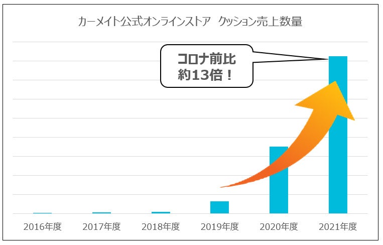 | ※参考1:クッション製品のニーズは、コロナ前の約13倍 当社公式オンラインストアの妊婦用抱き枕と授乳クッションの販売実績は、コロナ前と比べて約13倍となっておりました(下グラフ:2022年3月末)。テレワークの増加で肩こりや腰痛等の不調を感じる人が増える中、好調なクッションの開発ノウハウを活かし、快適なおうち時間をサポートする製品を開発いたしました。 |