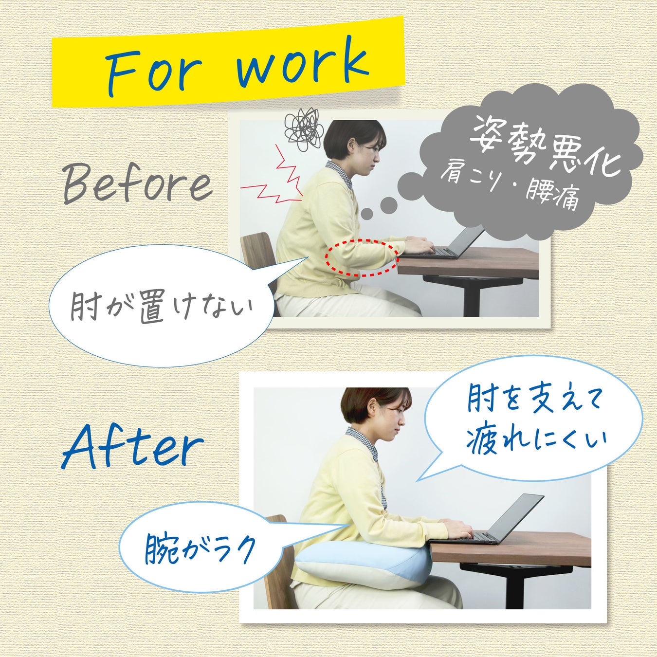 1、アームレスト(肘置き):おなかに装着して腕をサポート。自宅の狭いデスク上でもマウス操作やタイピングがしやすくなります。前かがみになりにくいため目線が上がり、姿勢が安定して背中への負担をやわらげます。