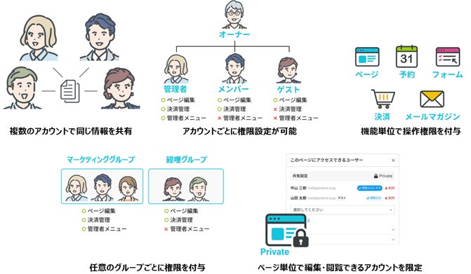 この機能を利用すれば、ペライチの機能ごとにアクセス権を管理し、複数人で共同利用・共同編集することが可能になります。また、権限は招待したアカウントごとだけでなく、グループ単位・機能単位でも制御できます。利用料金は招待したアカウントごとに発生するため、必要最低限のコストで運用いただけます。
