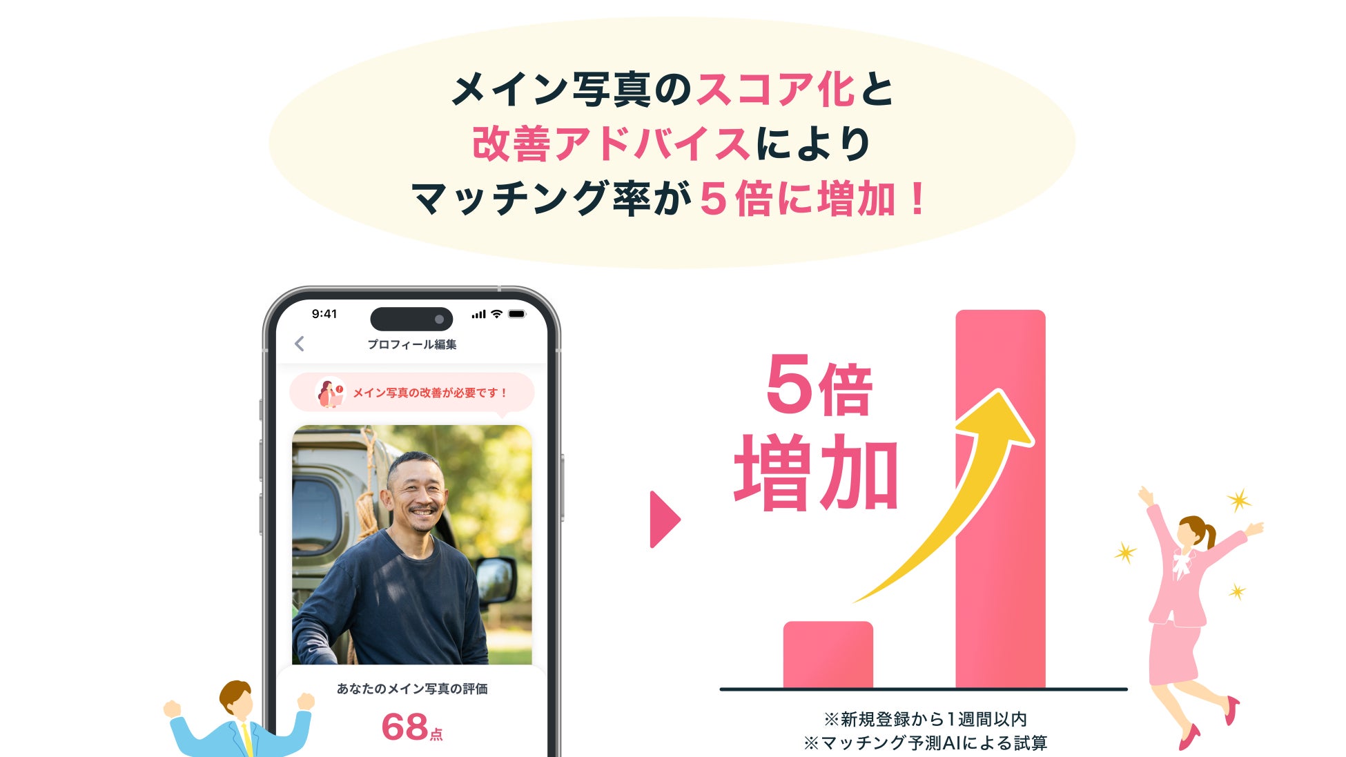 アイザック株式会社(本社:東京都渋谷区、代表取締役社長:田中和希)は、40歳以上向け恋活・婚活マッチングアプリ「ラス恋」において、100万枚以上の写真データを分析した独自AIによる「プロフィール画像診断」の提供を開始します(※)。自撮りや写真選択が苦手なミドルシニア世代の課題に対応することで、マッチング率の大幅な向上が期待されます。