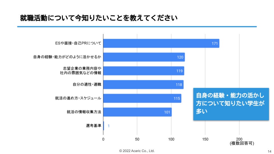 - 自身の経験・能力の活かし方について知りたい学生が多い