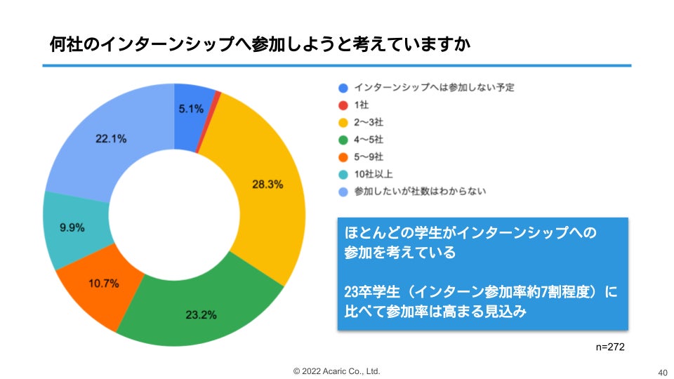 - ほとんどの学生がインターンシップへの参加を考えており、23卒と比較して参加率は高まる見込み