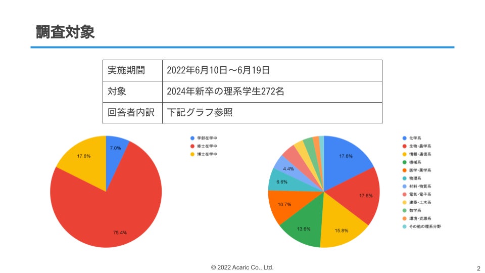 技術者・研究者のキャリア支援に特化した事業を15年にわたって続けている株式会社アカリク(本社:東京都渋谷区、代表取締役社長:山田諒、以下 アカリク)は、理系学生272名に対し、「就職活動の動向調査」を実施しましたので、お知らせいたします。